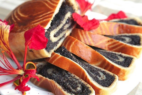 10. Стол присыпаем мукой и раскатываем тесто в пласт размером 30 на 20 см. Разрезаем вдоль на 2 части. Выкладываем маковую начинку оставляя по 2 см со всех сторон.
