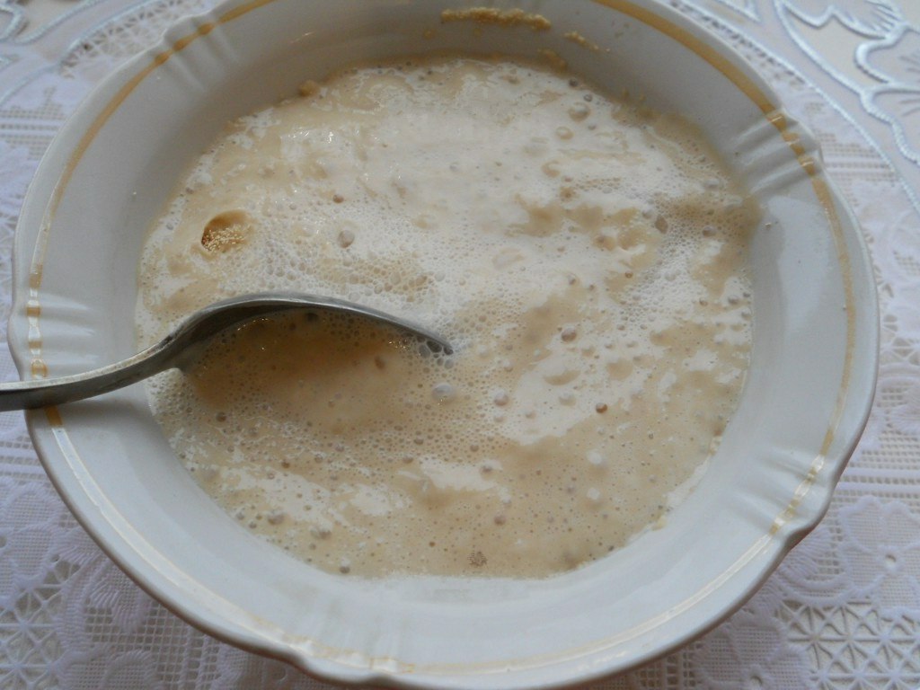 - В подошедшую дрожжевую смесь добавить яйцо, влить молоко и хорошо перемешать.