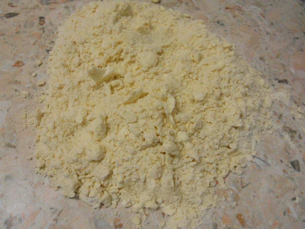 - Просеять муку на стол, смешать с солью и оставшимся сахаром. В муку порезать кусочками (или натереть) сливочное масло.