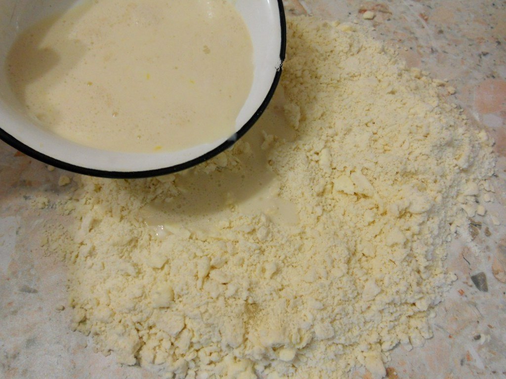 - Из мучной крошки сформировать горку, посередине сделать углубление. Влить жидкую смесь.