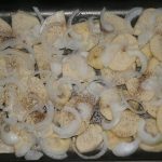 3. В смазанную маслом форму для запекания выложить половину картофеля, посолить, поперчить и сверху выложить лук.
