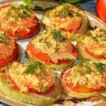 Обжаренные кабачки выложить на блюдо, сверху помидор и сырно-морковный салат.