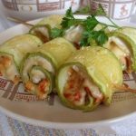 Скрутить рулетики из кабачков с куриным мясом, сколоть их шпажками и запечь при 180 градусах 25 минут.