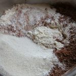 Смешать все сухие ингредиенты входящие в состав бисквита: муку, сахар, какао и разрыхлитель.