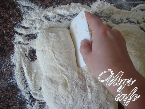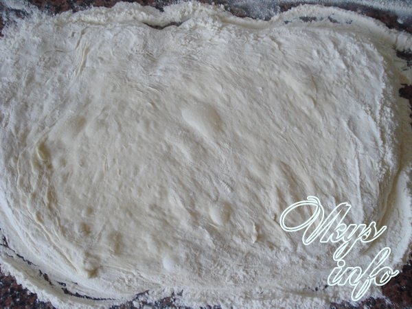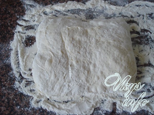 Присыпаем сверху мукой, растягиваем в квадрат.