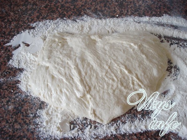 Созревшее тесто очень пузыристое и липкое. Аккуратно перекладываем его на разделочную доску, хорошо присыпанную мукой, стараясь не выпустить из него пузырьки.