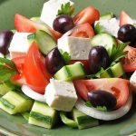 Очистите лук и нарежьте тонкими полукольцами. Овощи крупно нарежьте и сложите с салатницу. Сверху выложите лук, маслины и крупно нарезанный сыр фета. Заправьте салат лимонным соком, орегано и оливковым маслом, посолите и поперчите.