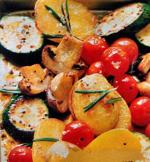Шампиньоны режем пополам, цукини – кружочками толщиной 1 см. Добавляем их к картошке и печем еще 15 минут. Далее отправляем туда же черри и бульон, запекаем еще 5 минут.