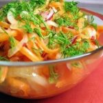 — Нарезаем соломкой три морковки, свеклу и лук, добавляем мелкие кубики твердого яблока и несколько сухофруктов — курага, чернослив. Добавить ягоды клюквы или зерна граната. Заправка — нежирный майонез.