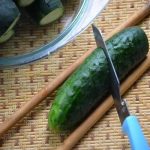 2. Две палочки положите вдоль огурца. И ножом под углом нарежьте. Палочки нужны, чтобы огурец резать не насквозь, а только надрезать, но чуть глубже середины.